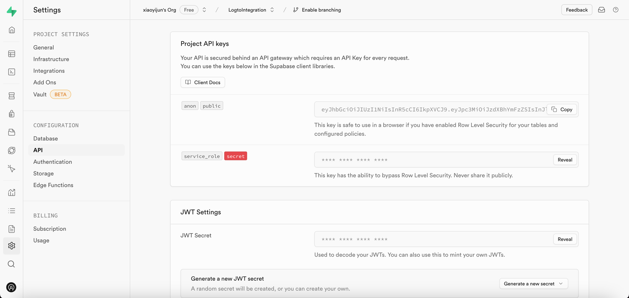 Firstly, we can obtain the JWT secret provided by Supabase from the “Project Settings” in the Supabase dashboard: